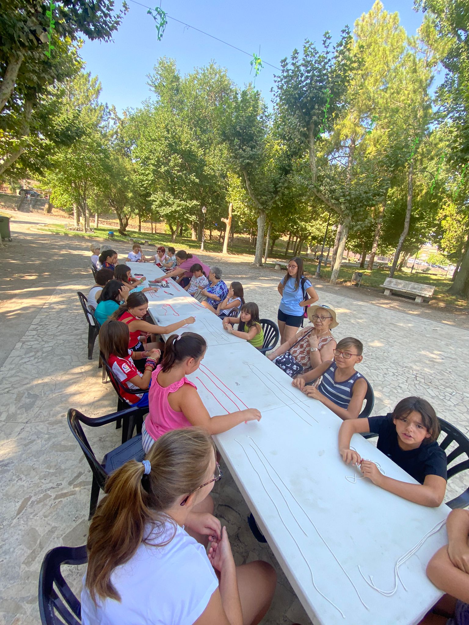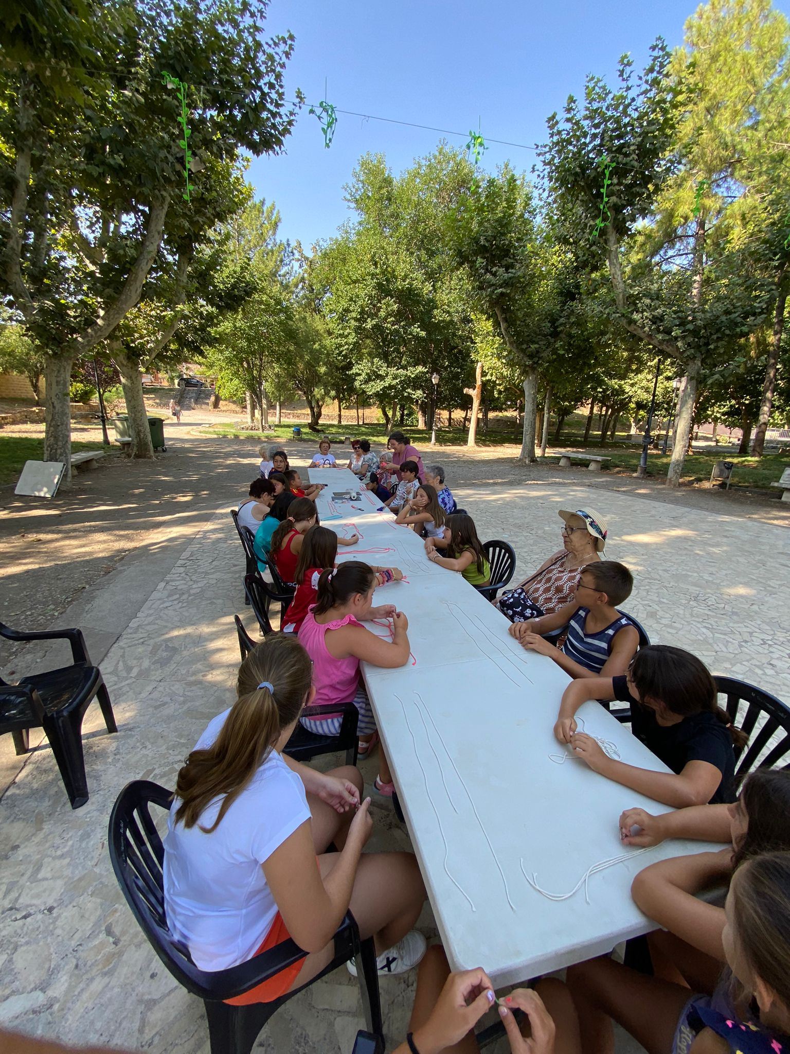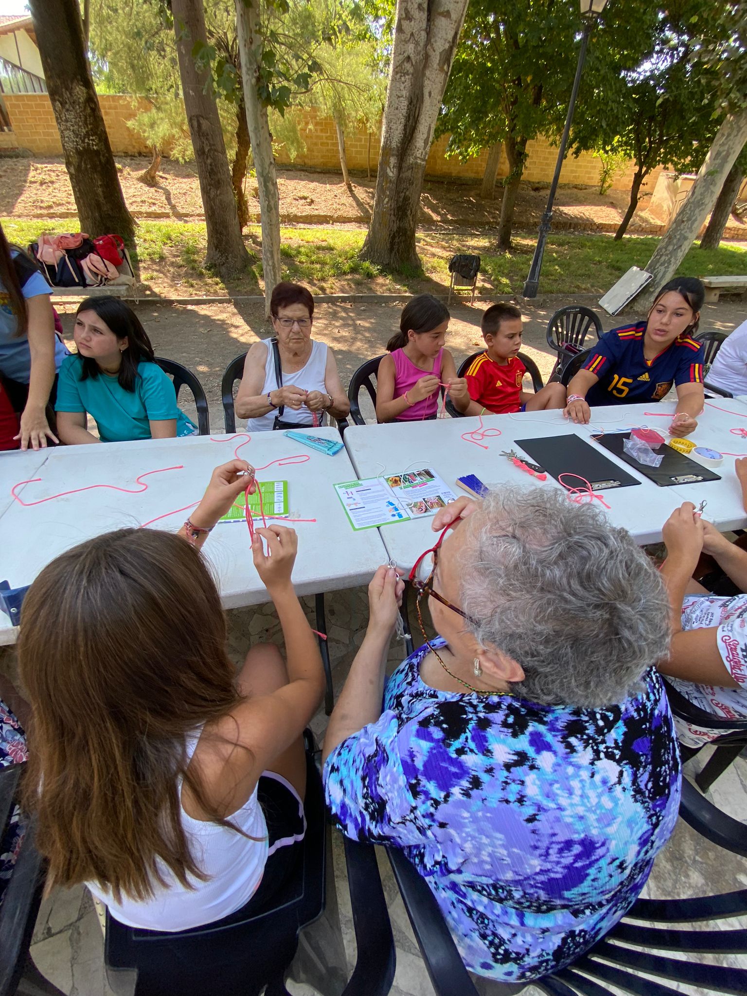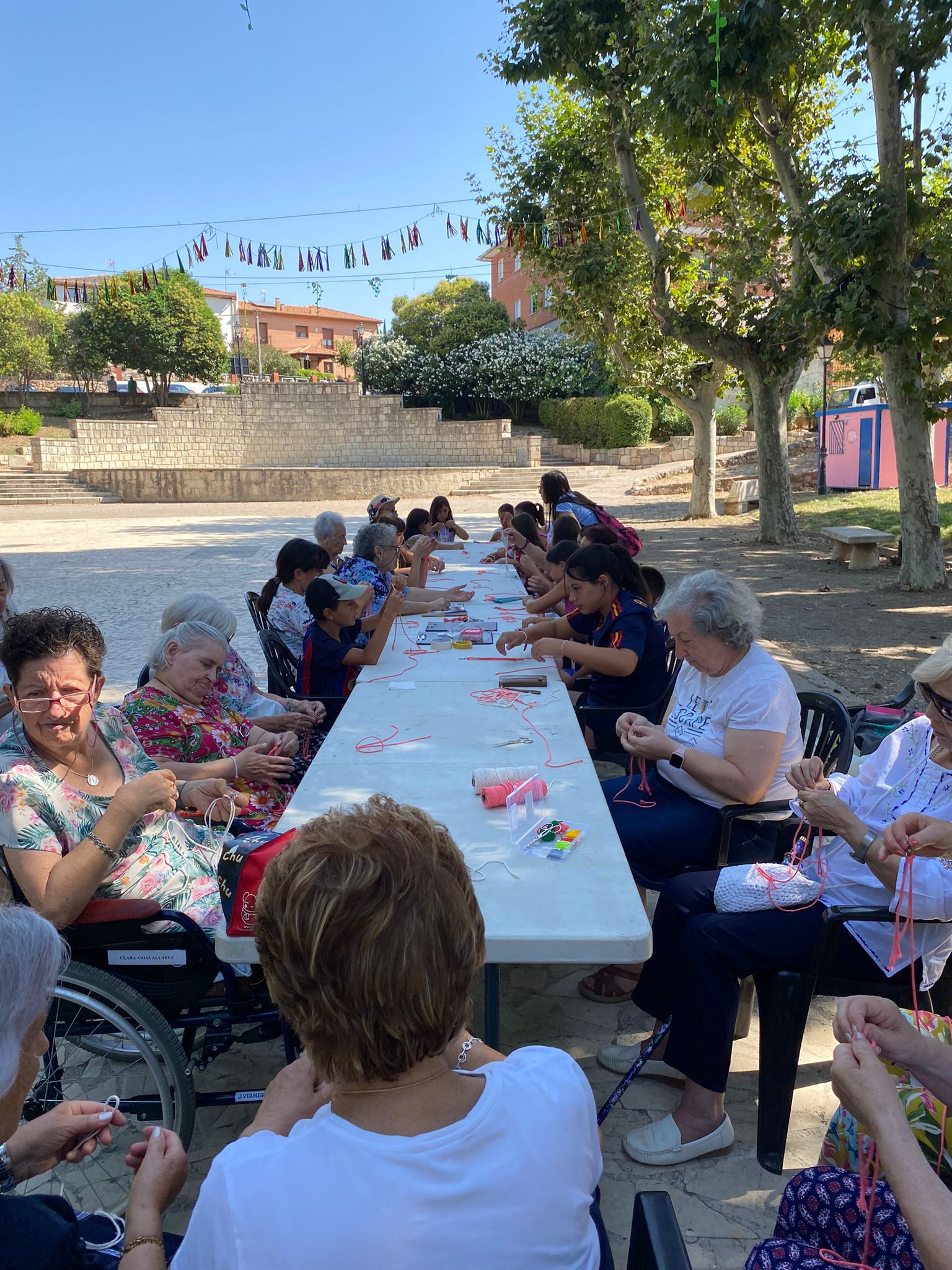 Esta vez una treintena de participantes formados por niños del campamento urbano y mayores del programa de envejecimiento activo se han dado cita en el pista del parque municipal, el jueves 8 a las 11 de la mañana para elaborar todos juntos un proyecto de macramé. El principal objetivo de estos talleres es  ayudar a la desaparición de estereotipos relacionados con las personas de edad avanzada, compartir conocimientos y generar espacios de comunicación  entre ambas generaciones.