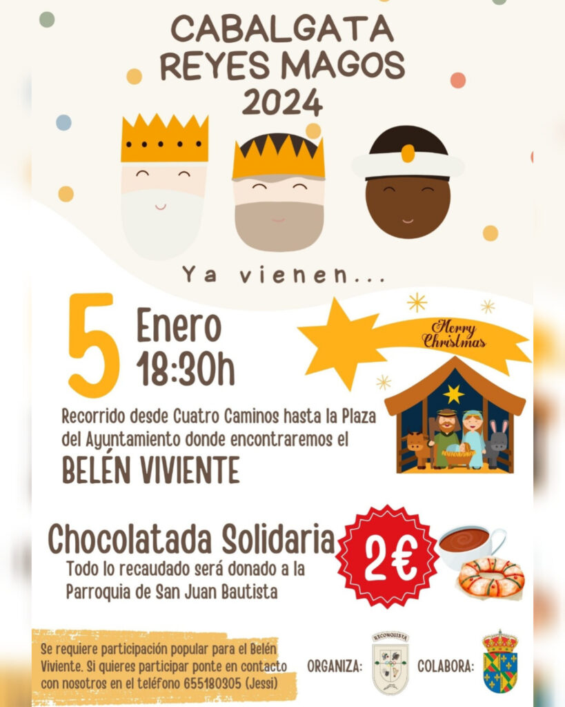 Habrá una cabalgata junto a los reyes y su carroza acompañada con música, hasta la Plaza Mayor, donde encontraremos el Belén viviente 👼,chocolate y un obsequio para los más pequeños.