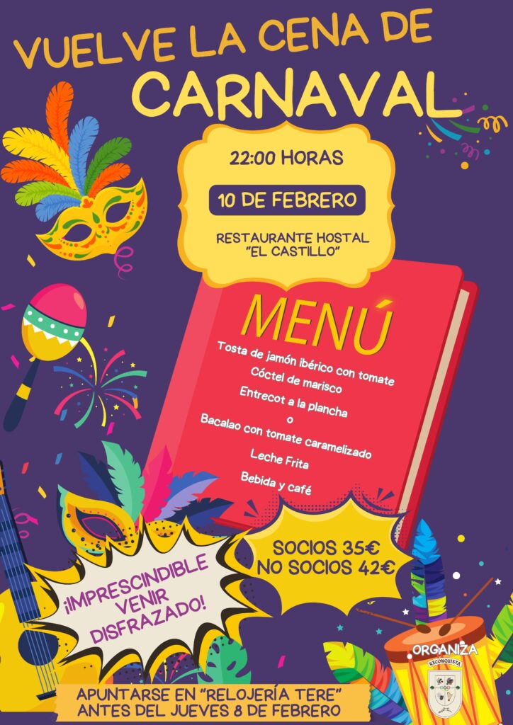 Cena de Carnaval Publicación de la entrada:1 febrero 2024 Categoría de la entrada:Actualidad Comentarios de la entrada:Sin comentarios ASOCIACION RECONQUISTA nos trae esta maravillosa iniciativa para el día de Carnaval. Una cena la cual no dejara a nadie indiferente. Asique busca tu mejor disfraz y ven a disfrutar de una velada increible NO TE QUEDES SIN TU PLAZA (APUNTARSE EN RELOJERIA TERE ANTES DEL 8 DE FEBRERO) También podría gustarte Semana Cultural ultimos actos 13 septiembre 2024 Castilblanco 5 junio 2020 Señalización vial 20 mayo 2020 Deja una respuesta Cancelar la respuestaComentarioIntroduce tu nombre o nombre de usuario para comentar Introduce tu dirección de correo electrónico para comentar Introduce la URL de tu web (opcional) Guarda mi nombre, correo electrónico y web en este navegador para la próxima vez que comente.