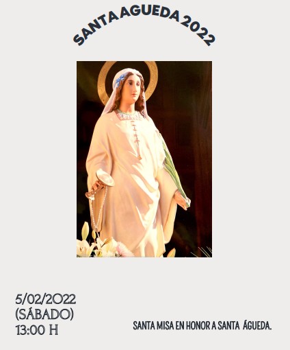 Festividad de Santa Águeda Publicación de la entrada:25 enero 2022 Categoría de la entrada:Actualidad / Fiestas Los próximos 4 y 5 de Febrero la cofradía de Santa Águeda celebraría los actos en honor a su patrona. Este año al igual que el pasado impedira que se celebre esta festividad. Por este motivo quedan suspendidos todos los actos menos la misa en honor a la patrona que tendrá lugar el dia 5 de Febrero a las 13 horas. Adjuntamos el programa.¡Viva Santa Águeda! También podría gustarte Torneo de Pádel 6 agosto 2022 Semana Cultural 6 septiembre 2024 SANTA AGUEDA 1986-2016 15 enero 2016