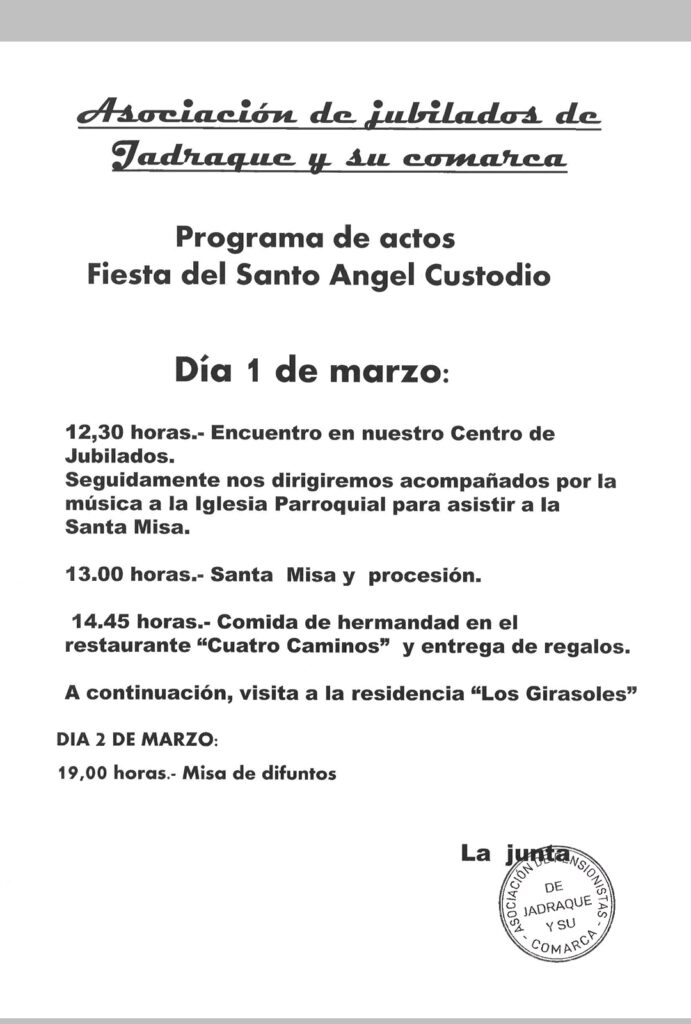 La Asociación de Jubilados y pensionistas de Jadraque y su comarca celebra el próximo 1 de Marzo de 2022 su fiesta.Tras el parón del año 2021 derivado por el covid este año volverán a contar con los actos tradicionales como la misa, procesión y comida.