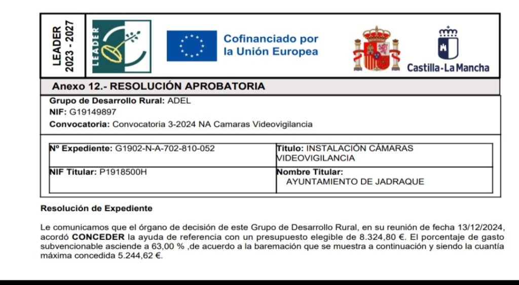 El Ayuntamiento de Jadraque, ha recibido por parte del grupo de accion local Adel Sierra Norte,la resolución positiva  para la financiación del 63% del proyecto de instalación de videocámaras de vigilancia en las entradas y salidas de los distintos puntos de nuestra localidad.