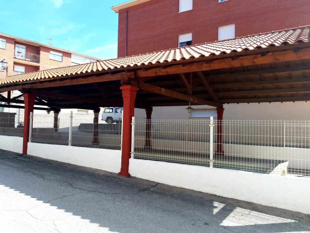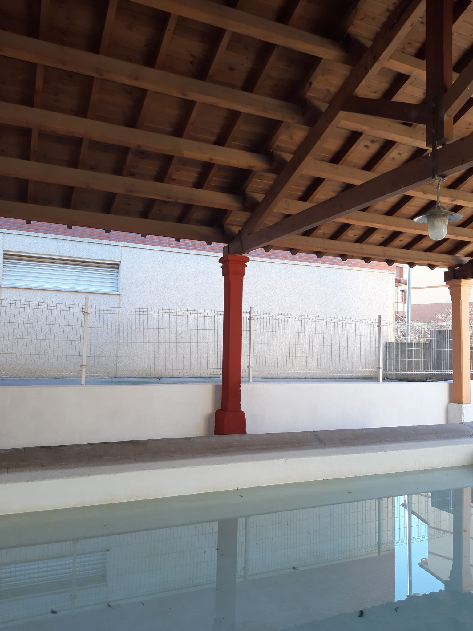 Los trabajos han consistido en un trabajo previo de sellado de grietas y fisuras, finalizando con un encolado y pintado de las paredes y columnas, también se ha procedido al barnizado y repintado las vigas de maderas tanto interiores como exteriores.