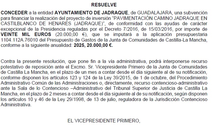 El ayuntamiento de Jadraque ha obtenido la resolución favorable, por parte del gobierno de la Junta de Comunidades de Castilla-La Mancha, de una subvención para pavimentar el camino de Jadraque en Castilblanco de H. Concretamente desde el cruce del Camino de Membrillera (subida al depósito del agua),hasta la calle de La Fuente.