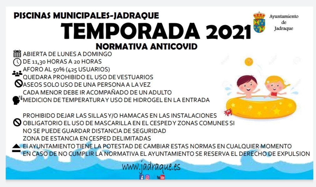 El próximo viernes día 25 de Junio se inaugura la temporada de piscinas 2021. 📎 Adjuntamos normativa y cuadro de precios. 👉 Los bonos familiares ya se pueden adquirir en las oficinas del Ayuntamiento. 👉 Este año se dará la posibilidad de pagar las entradas con tarjeta en las mismas instalaciones de las piscinas.