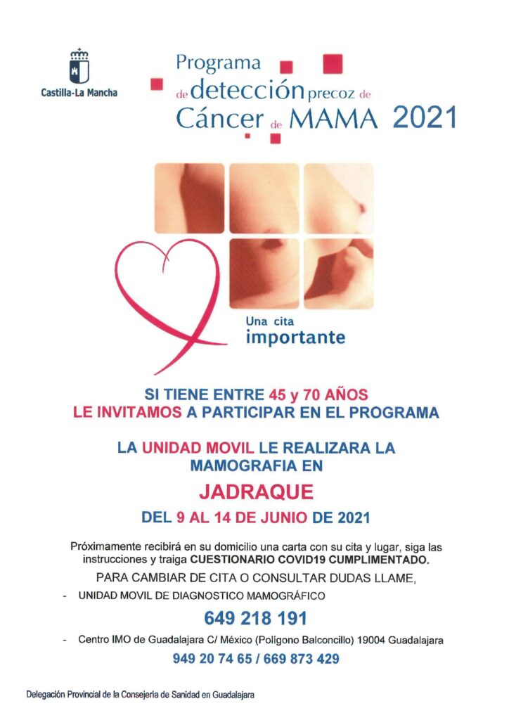 Prevención detención cancer de mama Publicación de la entrada:7 junio 2021 Categoría de la entrada:Actualidad La unidad móvil realizará mamografias para edades comprendidas entra 45 y 70 años. Del 9 al 14 de Junio Teléfonos 649218191 / 949207465 / 669873429 También podría gustarte Superluna en el Castillo 27 mayo 2021 Dia de la bicicleta 5 septiembre 2022 Torneo 3×3 de Baloncesto 7 septiembre 2022