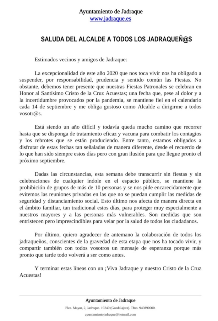 Saludo a todos los Jadraqueños Publicación de la entrada:12 septiembre 2020 Categoría de la entrada:Actualidad Con motivo del Día del Cristo de la Cruz Acuestas, el Alcalde de Jadraque, Héctor Gregorio, Saluda a todos los Jadraqueños. También podría gustarte Interpueblos 2019 1 agosto 2019 Festividad San Angel Custodio 24 febrero 2022 Jadraque 20 abril 2019