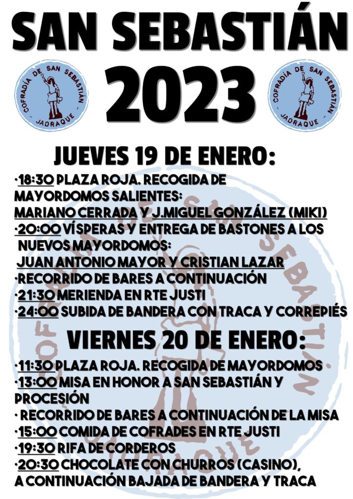 San Sebastián Publicación de la entrada:15 enero 2023 Categoría de la entrada:Actualidad La Cofradía de San Sebastián celebrará los próximos días 19 y 20 de Enero los actos de su festividad. Adjuntamos programa de actos. También podría gustarte Día de la Biblioteca 20 octubre 2019 Exposición «Un Patrimonio de todos» 25 junio 2021 Inauguración placa Homenaje 20 septiembre 2021