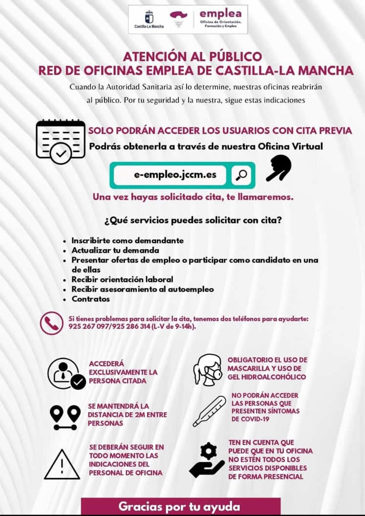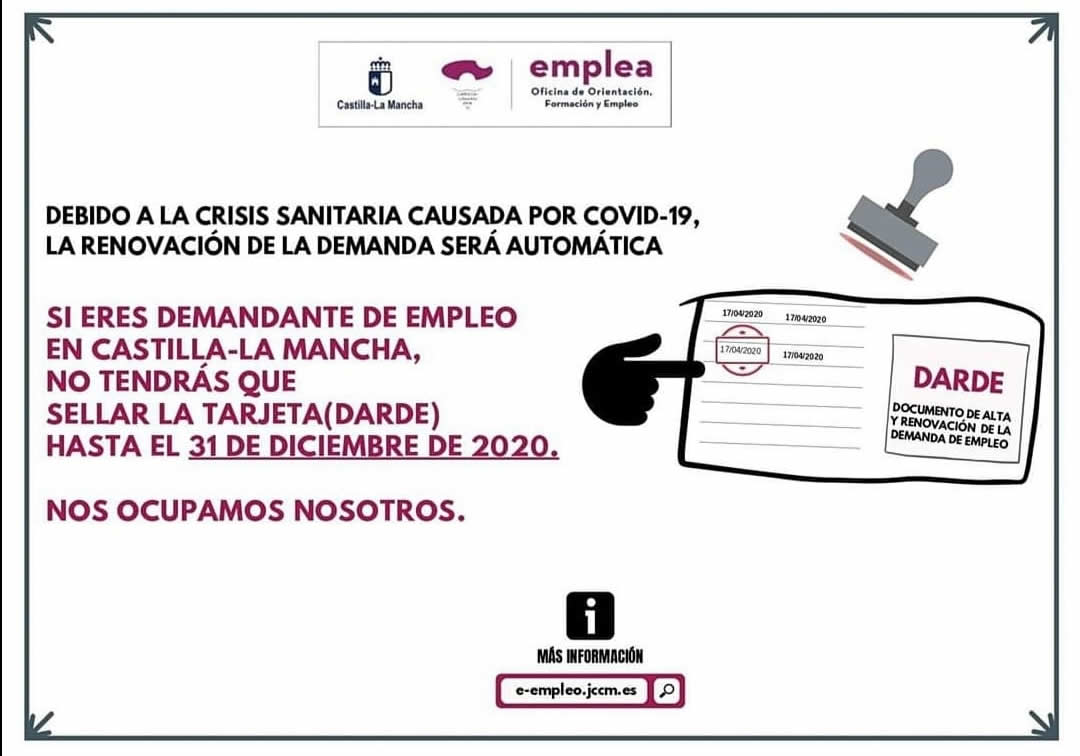 El Servicio de Empleo recuerda que la renovación de la tarjeta de demanda a los demandantes de empleo será automática hasta el 31 de diciembre debido a la crisis sanitaria. Asimismo, advierte que las oficinas del Servicio de Empleo sólo atienden con CITA PREVIA, que se puede solicitar a través de la oficina virtual en la dirección: e-empleo.jcccm.es y en los teléfonos 925267097/925286314 de lunes a viernes de 9 a 14 horas.