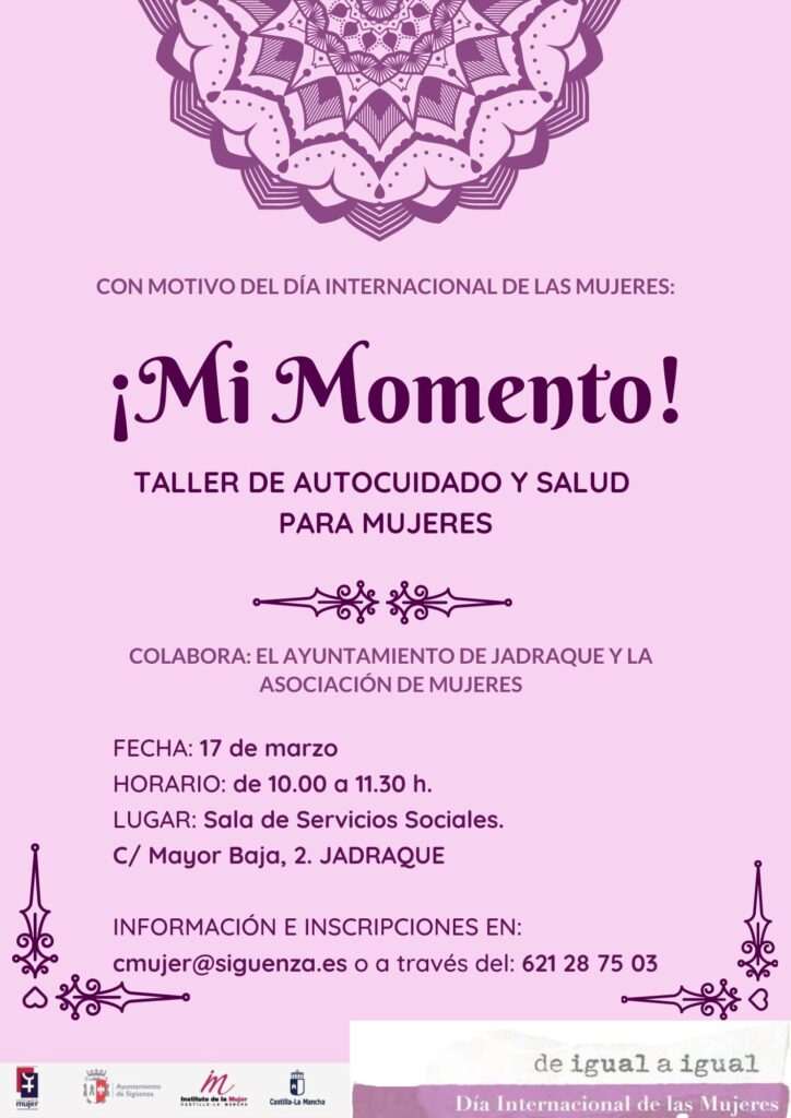 Taller autocuidado Publicación de la entrada:4 marzo 2022 Categoría de la entrada:Actualidad 𝗧𝗮𝗹𝗹𝗲𝗿 𝗮𝘂𝘁𝗼𝗰𝘂𝗶𝗱𝗮𝗱𝗼 𝘆 𝘀𝗮𝗹𝘂𝗱 𝗽𝗮𝗿𝗮 𝗺𝘂𝗷𝗲𝗿𝗲𝘀Con motivo del Día Internacional de la mujer Jueves 17 de Marzo de 2022 De 10 a 11,30h Centro social de Jadraque También podría gustarte Apertura piscinas 2025 17 junio 2025 I Liga de padel 31 julio 2024 Tenorio 2021 – Grupo de Teatro Alkala nahar 24 noviembre 2021