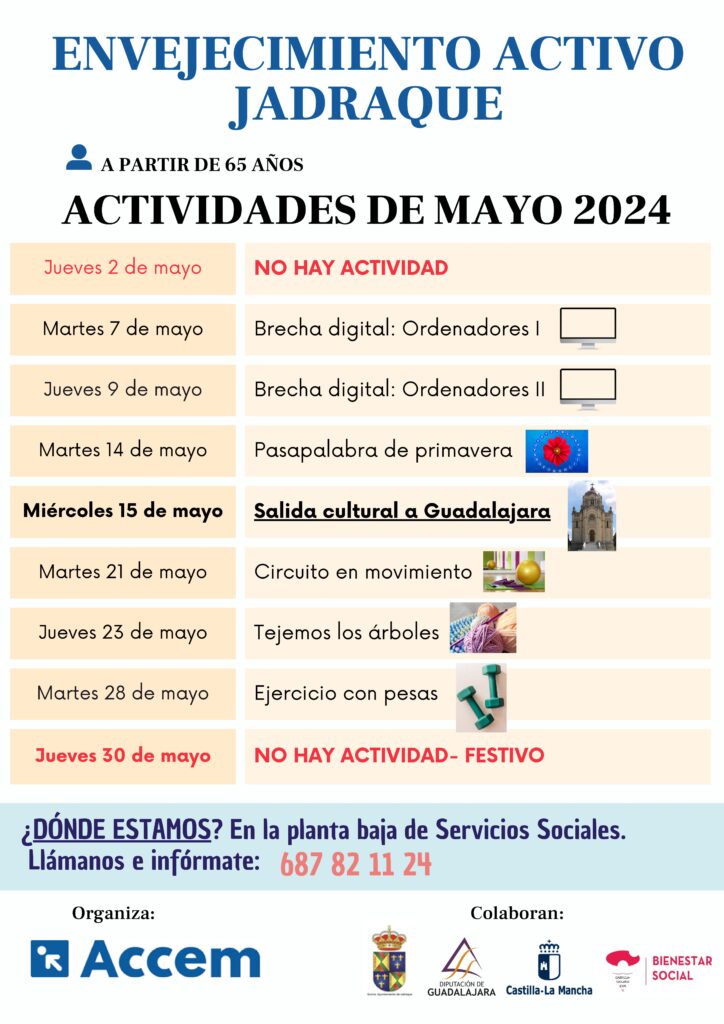Taller envejecimiento activo Publicación de la entrada:2 mayo 2024 Categoría de la entrada:Actualidad 𝙏𝙖𝙡𝙡𝙚𝙧𝙚𝙨 𝙚𝙣𝙫𝙚𝙟𝙚𝙘𝙞𝙢𝙞𝙚𝙣𝙩𝙤 𝙖𝙘𝙩𝙞𝙫𝙤 Presentamos los talleres impartidos por Accem durante el mes de Mayo de 2024. ¡Doble sesión semanal! Horario de mañana. Centro social de Jadraque. Apúntate en:687 82 11 24 También podría gustarte Servicios Básicos Esenciales 15 marzo 2020 Torneo 3×3 de Baloncesto 7 septiembre 2022 Semana Santa Cultural 2024 1 abril 2024