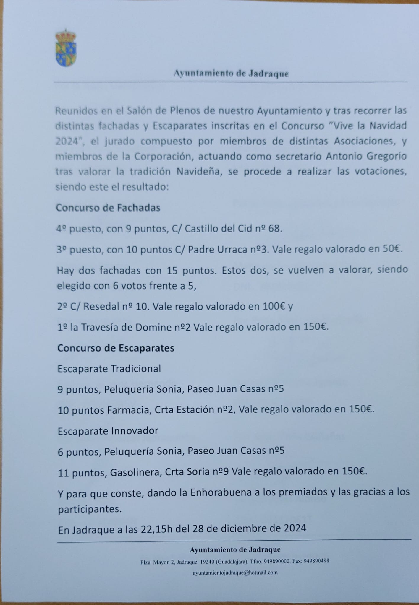 El sábado 28 de diciembre por la tarde, representantes de las distintas Asociaciones y miembros del Ayuntamiento de Jadraque, bien abrigados comenzaron la ruta visitando los distintos Escaparates y Fachadas inscritos en el concurso «Vive la Navidad 2024».