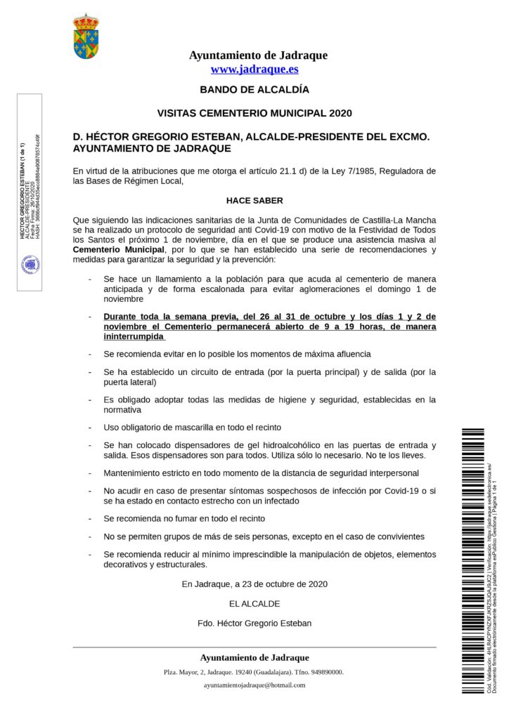 BANDO «RECOMENDACIONES SOBRE LAS VISITA A ️CEMENTERIOS POR LA FESTIVIDAD DE TODOS LOS SANTOS EN EL CONTEXTO DE LA PANDEMIA DE COVID-19» Ininterrumpido de 9 a 19 horas Uso obligatorio de mascarillas Grupos máximos de 6 personas Respetar flujo de personas, entrada puerta principal y salida puerta lateral.