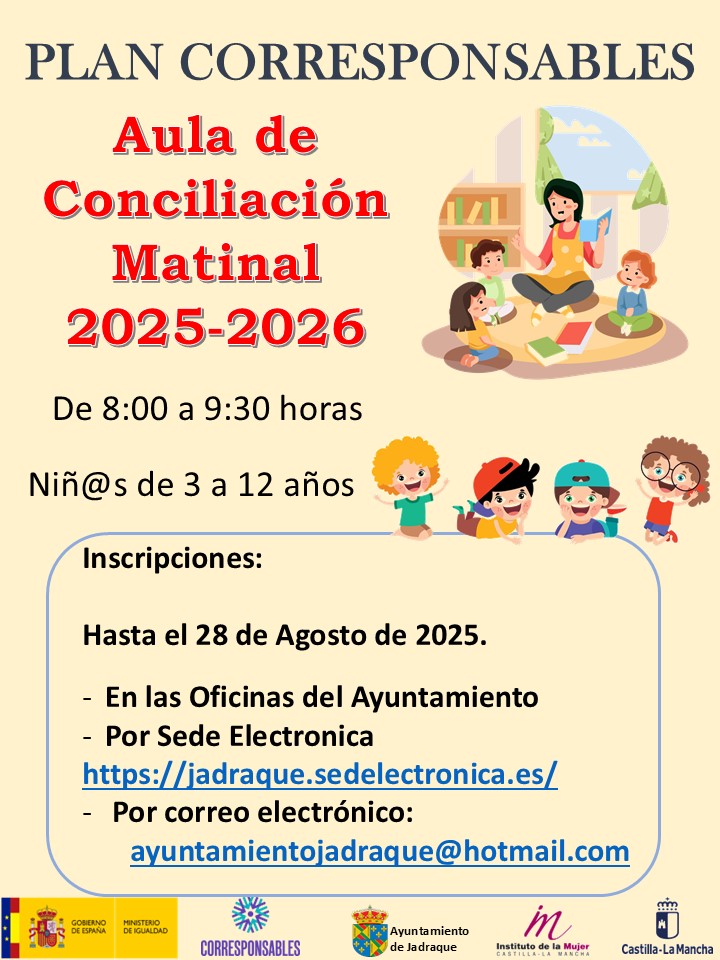 Aula matinal 2025_2026 Publicación de la entrada:25 agosto 2025 Categoría de la entrada:Convocatorias 𝘼𝙪𝙡𝙖 𝙢𝙖𝙩𝙞𝙣𝙖𝙡 2025-2026 ABIERTO PLAZO INSCRIPCIONES AULA MATINAL CURSO 2025-2026 De 8:00h a 9:30h. De 3 a 12 años Formulario de inscripción No lo dejes para el último día,¡plazas limitadas! ¿Como hacerlo? – ACUDIENDO AL AYUNTAMIENTO – REGISTRO ELECTRONICO (jadraque.sedelectronica.es) Haz clic aquí para descarga formulario de inscripción También podría gustarte Actividades Acuáticas 17 junio 2025 Conferencia sobre Digitalización y Emprendimiento 17 noviembre 2023 Convocatoria puesto socorrista 9 mayo 2024