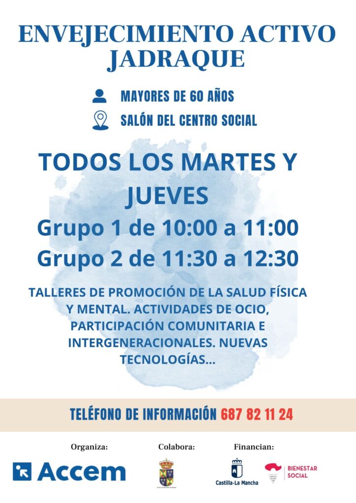 Envejecimiento Activo Publicación de la entrada:11 abril 2026 Categoría de la entrada:Convocatorias Tras el parón de Semana Santa, retomamos las actividades de envejecimiento activo en Jadraque 💙📍 Nos vemos en el Centro Social📅 Todos los martes y jueves🕙 Grupo 1: de 10:00 a 11:00 h🕦 Grupo 2: de 11:30 a 12:30 hUn espacio para compartir, mantenerse activo y disfrutar con actividades de salud física y mental, ocio y nuevas tecnologías.¡Os esperamos! 😊 También podría gustarte Oferta Actividades Deportivas 20 septiembre 2023 Programa Recual fase concurso aspitantes 8 abril 2024 II Ciclo de Conferenacias «AQUA: el movimiento del agua en las Artes» 2 abril 2026