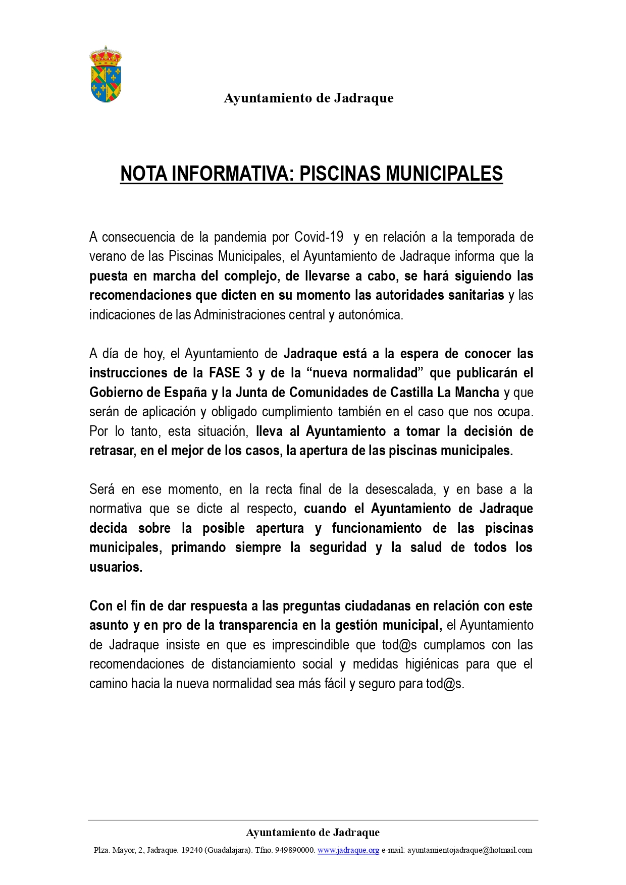 A día de hoy, el Ayuntamiento de Jadraque está a la espera de conocer las instrucciones de la FASE 3 y de la “nueva normalidad” que publicarán el Gobierno de España y la Junta de Comunidades de Castilla La Mancha y que serán de aplicación y obligado cumplimiento también en el caso que nos ocupa. Por lo tanto, esta situación, lleva al Ayuntamiento a tomar la decisión de retrasar, en el mejor de los casos, la apertura de las piscinas municipales. Será en ese momento, en la recta final de la desescalada, y en base a la normativa que se dicte al respecto, cuando el Ayuntamiento de Jadraque decida sobre la posible apertura y funcionamiento de las piscinas municipales, primando siempre la seguridad y la salud de todos los usuarios. Con el fin de dar respuesta a las preguntas ciudadanas en relación con este asunto y en pro de la transparencia en la gestión municipal, el Ayuntamiento de Jadraque insiste en que es imprescindible que tod@s cumplamos con las recomendaciones de distanciamiento social y medidas higiénicas para que el camino hacia la nueva normalidad sea más fácil y seguro para tod@s.