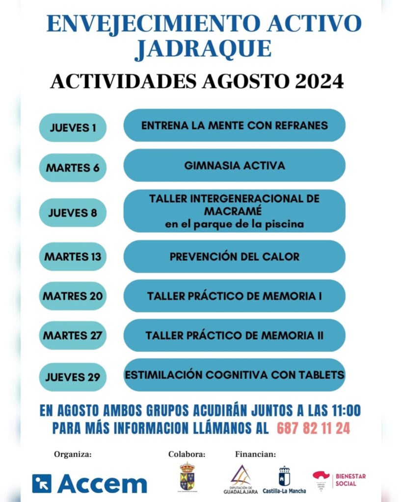 Taller envejecimiento activo Publicación de la entrada:30 julio 2024 Categoría de la entrada:Convocatorias Presentamos los talleres impartidos por Accem durante el mes de agosto de 2024. ¡Doble sesión semanal! Horario de mañana.Centro social de Jadraque. Apúntate en: 687 82 11 24 También podría gustarte Monitor Escuela Verano 27 junio 2019 Taller envejecimiento activo 2 abril 2024 Coloquio: Pueblos Vivos 9 octubre 2025