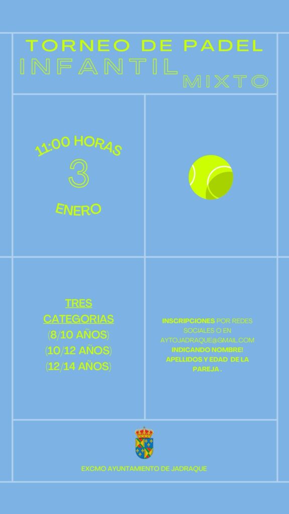 Torneo Infantil de Padel Mixto Publicación de la entrada:27 diciembre 2023 Categoría de la entrada:Convocatorias Como ya habréis podido ver en la programación de Navidad este 3 de enero tenemos torneo de pádel mixto infantil. Todo el que se quiera apuntar que realice la inscripción tanto suya como la de su pareja a partir de hoy hasta el 1 de enero. Como veis, disponemos de tres categorías: 8/10 años 10/12 años 12/14 años También podría gustarte Talleres envejecimiento activo 3 noviembre 2023 Taller para familias 20 enero 2022 Interpueblos 2019 1 agosto 2019