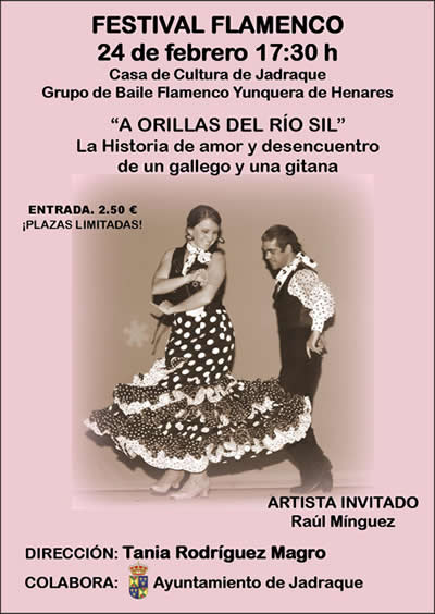 La Casa de la Cultura de Jadraque es el escenario elegido por el Grupo de Baile Flamenco de Yunquera de Henares para representar el Festival Flamenco “A Orillas del río Sil”. La actuación será el domingo 24 de febrero a las cinco y media de la tarde en la Casa de la Cultura de Jadraque.