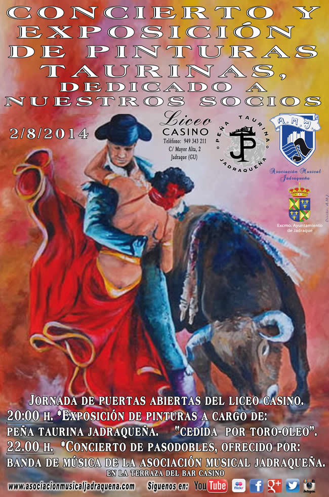 El sábado 2 de agosto, en el Casino a partir de las 20 horas, exposición de pinturas taurinas y a las 22:00h. concierto de pasodobles de la Banda de la Asociación Musical Jadraqueña, dedicado a los socios de la Asociación Casino, de la Peña Taurina y de la Asociación Musical