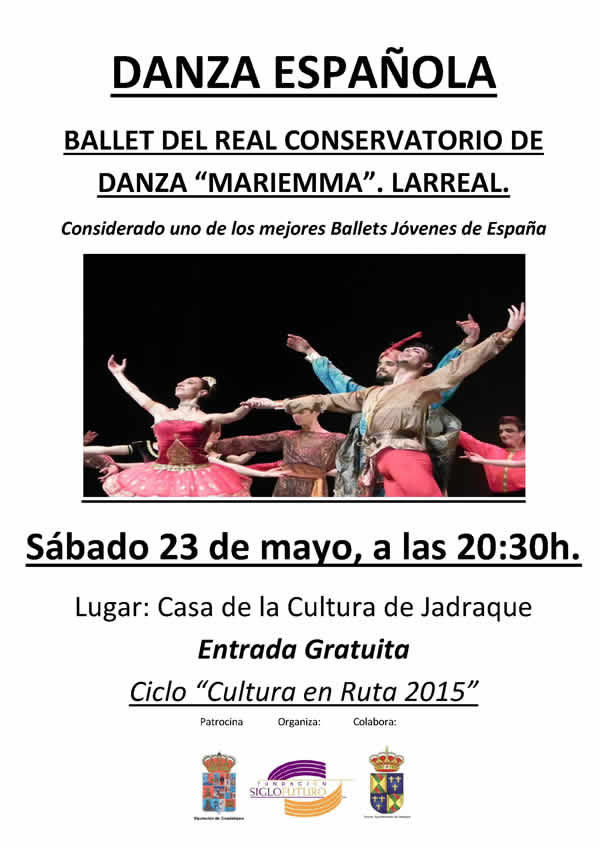 El sábado 23 de mayo a las 20:30h. en la Casa de la Cultura con entrada gratuita, Ballet del Real Conservatorio de Danza “Mariemma” Larreal. Ciclo Cultura en Ruta 2015. Considerado uno de los mejores Ballets Jóvenes de España. Organiza. Fundación Club Siglo Futuro. Patrocina: Diputación de Guadalajara. Colabora: Ayuntamiento de Jadraque.