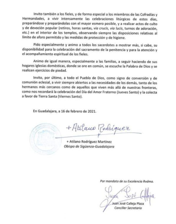 A consecuencia de la situación sanitaria, el Obispado de Sigüenza-Guadalajara decreta la suspensión de procesiones y estaciones de penitencia que se hubieran celebrado en la vía pública con motivo de la Semana Santa 2021. Por tanto, las celebraciones religiosas de la Semana Santa Jadraqueña quedarán reducidas a las que se celebren en el interior del templo, conforme programa adjunto, elaborado por la parroquia de San Juan Bautista de común acuerdo con las cofradías locales y cumpliendo todas las medidas de seguridad contra el Covid-19