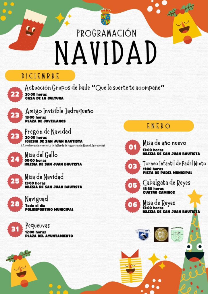 Programación Navidad 2023 Publicación de la entrada:11 diciembre 2023 Categoría de la entrada:Cultura PROGRAMACIÓN NAVIDAD Os traemos un calendario con toda la programación para estas navidades A medida que se vayan acercando los días, sacaremos el cartel correspondiente para cada actividad⚠️Os esperamos 🎁 También podría gustarte Jornada Literaria 3 noviembre 2014 Concierto Navidad AMJ 19 noviembre 2014 Exposicion de fotografia 26 septiembre 2019