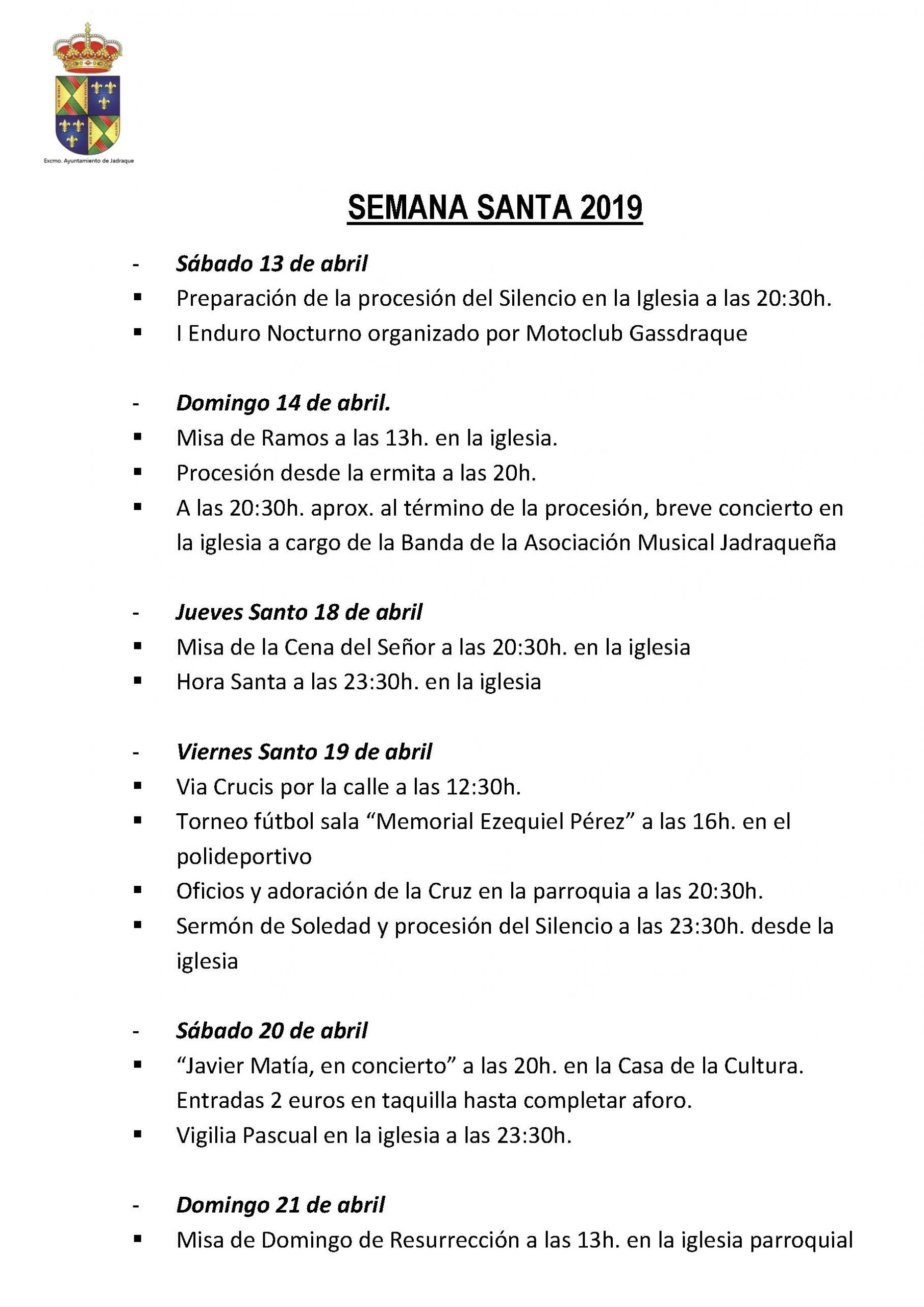 SEMANA SANTA JADRAQUEÑA Publicación de la entrada:10 marzo 2019 Categoría de la entrada:Cultura Los horarios de todas las convocatorias culturales, religiosas y deportivas para Semana Santa. También podría gustarte Cultura 30 marzo 2013 Teatro de Guiñol 31 marzo 2025 Teatro 2 octubre 2014