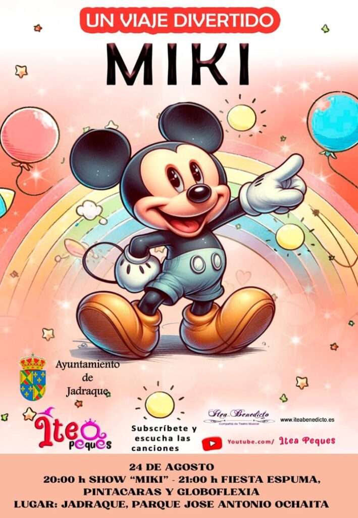 Show de Miki Publicación de la entrada:14 agosto 2025 Categoría de la entrada:Cultura 𝔸𝕔𝕥𝕦𝕒𝕔𝕚𝕠́𝕟 𝕞𝕦𝕤𝕚𝕔𝕒𝕝 𝕚𝕟𝕗𝕒𝕟𝕥𝕚𝕝 Desde la 20h (cambio de hora respecto al indicado en el programa oficial) Anfiteatro parque municipal José Antonio Ochaíta. Show de Miki,pintacaras,globoflexia…fiesta de la espuma!! También podría gustarte Rutas Literarias 9 agosto 2015 Teatro Adultos » La penúltima en casa» 11 marzo 2024 CONCIERTO BANDA MUSICAL 30 agosto 2023