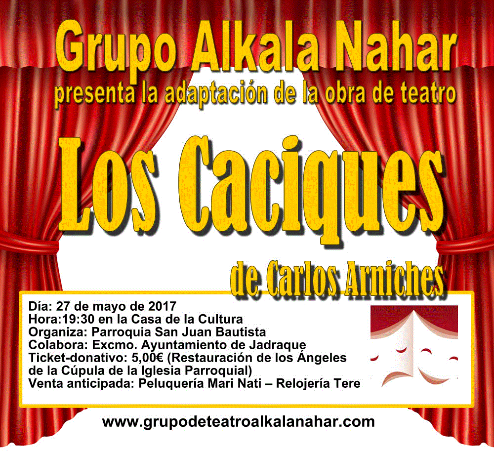 Teatro Publicación de la entrada:4 mayo 2017 Categoría de la entrada:Cultura El sábado 27 de mayo a las 19:30h. en la Casa de la Cultura de Jadraque, Teatro a beneficio de la Parroquia de Jadraque para la restauración de las pechinas de la cúpula. Grupo: Alkala Nahar También podría gustarte Danza Española 31 marzo 2015 Exposicion 4 junio 2012 VI Encuentro de Bandas 2 junio 2014