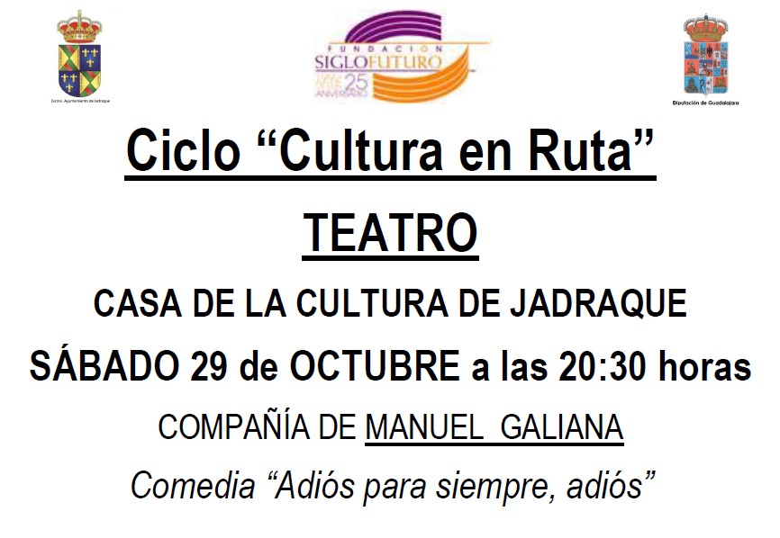 La compañía de teatro de Manuel Galiana actúa en la Casa de la Cultura de Jadraque el sábado 29 de octubre a las 20:30h. con la comedia “Adiós para siempre, adiós”. Organiza: Fundación Siglo Futuro. Patrocina: Diputación de Guadalajara. Colabora: Ayuntamiento de Jadraque