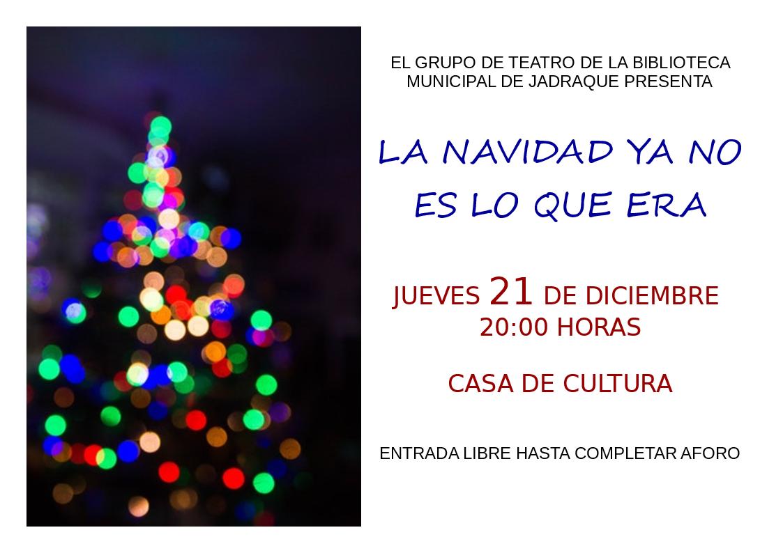 El Grupo de Teatro de la Biblioteca Municipal de Jadraque presenta “La Navidad ya no es lo que era” el jueves 21 de diciembre en la Casa de la Cultura a las ocho de la tarde con entrada libre hasta completar aforo. Organiza: Excmo. Ayuntamiento de Jadraque