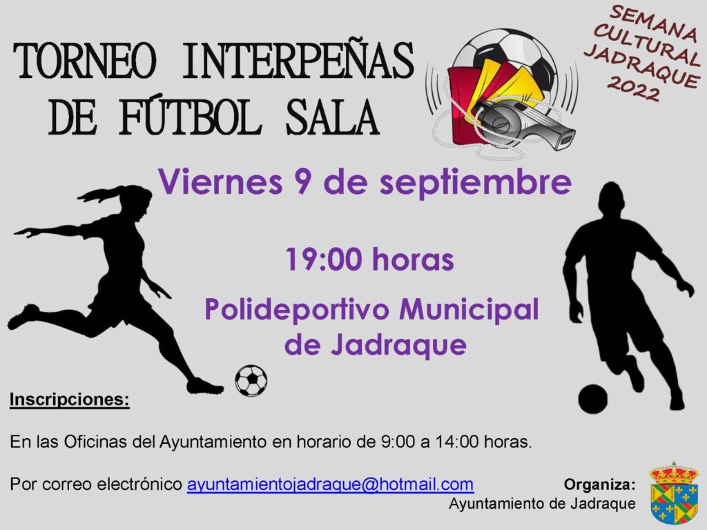 Torneo interpeñas de Futbol Sala 09/09/2022 Publicación de la entrada:5 septiembre 2022 Categoría de la entrada:Cultura El próximo Viernes día 9 de Septiembre tendrá lugar el ya tradicional torneo de fútbol sala Interpeñas 📆 Viernes 9 de Septiembre de 2022 📍 Polideportivo Municipal de Jadraque🕜19 horas También podría gustarte Concierto en nuestra Iglesia 12 octubre 2023 Fin de Curso 17 junio 2019 Concierto Musicacore 12 julio 2021