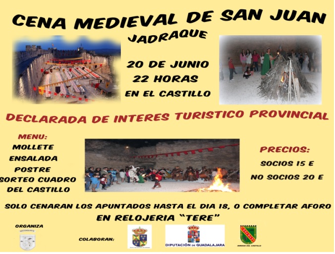 AFORO COMPLETO / XXVII Cena de San Juan Publicación de la entrada:19 mayo 2015 Categoría de la entrada:Fiestas AFORO COMPLETO Abierto el plazo de inscripción para asistir a la XXVII Cena Medieval y Hoguera de San Juan en el castillo del Cid el sábado 20 de junio. También podría gustarte Pregón de Navidad 14 diciembre 2018 Pregón Fiestas 2016 2 septiembre 2016 Peña Taurina 15 noviembre 2014
