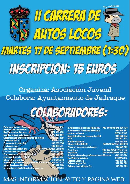 La carrera de Autos Locos en las Fiestas 2013 será la noche del 17 al 18 de septiembre. Presentar inscripción hasta el día 13 en el Ayuntamiento de 13:30 a 14:30h.