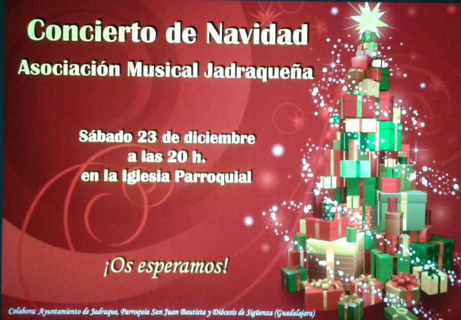 Concierto de Navidad Publicación de la entrada:22 diciembre 2017 Categoría de la entrada:Fiestas La Banda de la Asociación Musical Jadraqueña ofrecerá el concierto de Navidad el sábado 23 de diciembre a las 20h. en la iglesia parroquial. También podría gustarte San Antón 2 enero 2017 Feria Chica 2016 14 abril 2016 Procesión 2015 12 septiembre 2015