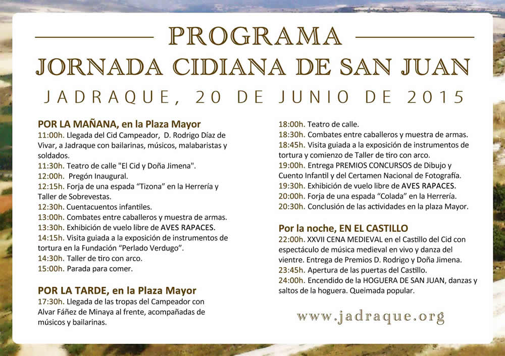 Jadraque celebra el sábado 20 de junio la III Jornada Cidiana, XXVII Cena Medieval y Hogueras de San Juan, declarada de Interés Turístico Provincial. Descargar cartel y programa