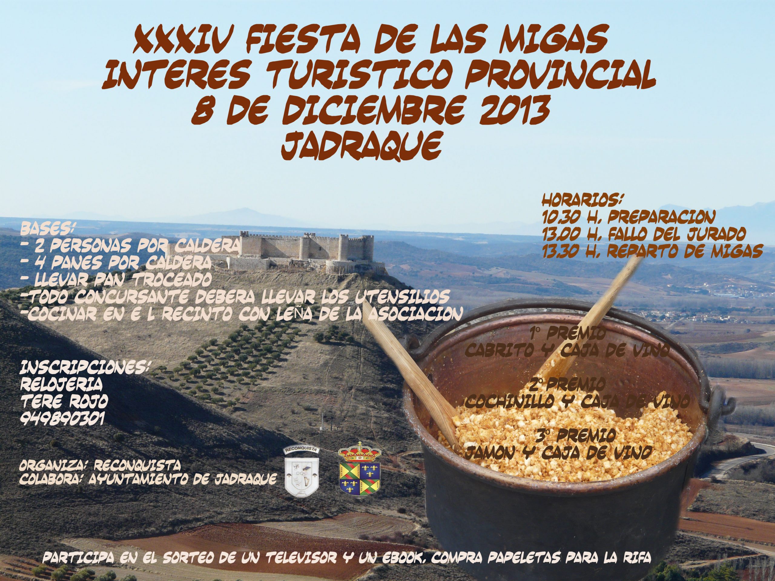 La Asociación “Reconquista” de Jadraque ha convocado la XXXIV Fiesta de las Migas, declarada de Interés Turístico Provincial que se celebrará en la localidad el domingo 8 de diciembre. Como manda la tradición, esta Fiesta se calcula que reunirá este año como cada segundo domingo de diciembre a unas 3000 personas y a medio centenar de calderos participantes. Las inscripciones pueden formalizarse ya en el comercio local Relojería “Tere”, por teléfono en el 949 890301 o por correo electrónico en la dirección reconquistajadraque@gmail.com . Teniendo en cuenta que la celebración coincide este año con el puente de la Constitución, se espera, si cabe una mayor afluencia de público.
