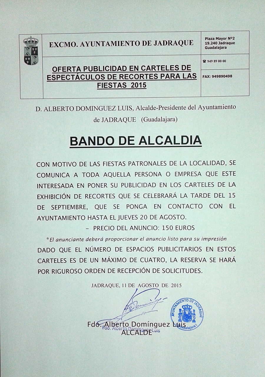 Publicidad 2015 Publicación de la entrada:5 agosto 2015 Categoría de la entrada:Fiestas Hasta el 20 de agosto, los interesados en poner publicidad en el cartel de la Exhibición de Recortes de las Fiestas Patronales deben comunicarlo al Ayuntamiento. También podría gustarte Festividad de Santa Águeda 25 enero 2022 Carteles Fiestas 2014 11 septiembre 2014 Carnaval 2016 15 enero 2016