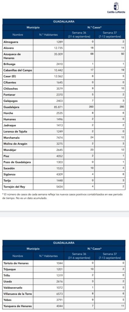Casos Covid-19 Publicación de la entrada:17 septiembre 2020 Categoría de la entrada:Salud 📊Ya están disponibles los datos semanales de casos confirmados en municipios de más de 1000 habitantes. 📅 Semanas 36 y 37 (31 de agosto al 13 de septiembre) En Jadraque aunque la situación es estable sigue habiendo nuevos casos, lo que obliga a seguir las restricciones. También podría gustarte Educación Sanitaria 11 agosto 2020 Covid 19 Semana 14 16 abril 2021 COVID19 Semana 12 4 abril 2021