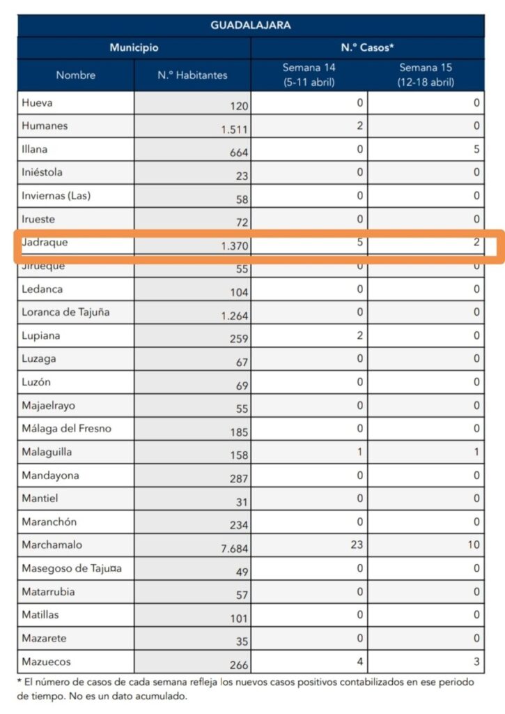 Información de todos los municipios de la provincia. En Jadraque , con los datos facilitados por el Gobierno de Castilla-La Mancha, tenemos en 𝗦𝗘𝗠𝗔𝗡𝗔 15 𝗗𝗘𝗟 𝗔𝗡̃𝗢, 𝗗𝗘𝗟 12 𝐃𝐄 ABRIL 𝗔𝗟 18 𝗗𝗘 𝐀𝐁𝐑𝐈𝐋 2021 semana pasada, DOS (2) positivos por COVID-19.